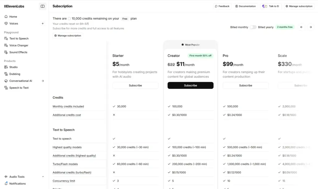 アカウント作成が完了すると、ダッシュボードに自動的に移動します。最初は無料プランになっていますが、これでも十分に機能を試すことができます。無料プランでは月間で一定量のクレジット(約10,000クレジット=約10分の高品質音声生成)が付与されます。